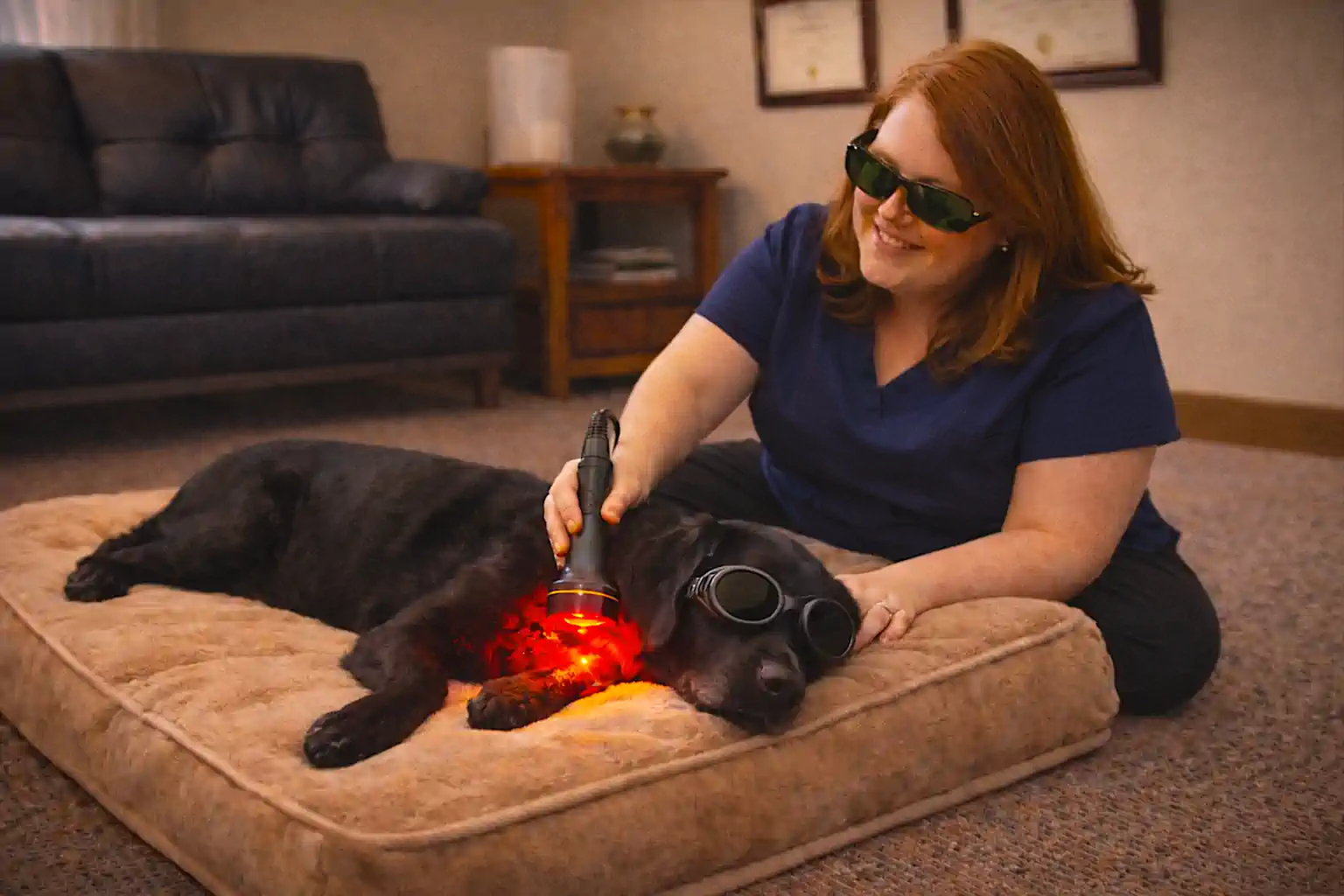 Laser therapy sessions are quick, painless, and relaxing for most pets. Many animals visibly relax during treatment.